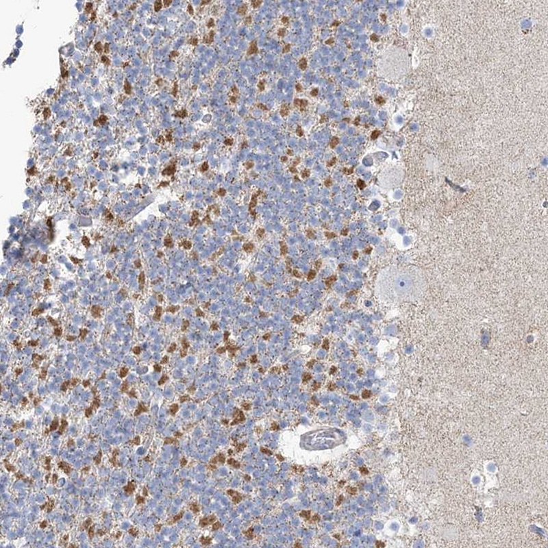 Immunohistochemical staining of human skeletal muscle shows moderate to strong cytoplasmic positivity in myocytes.