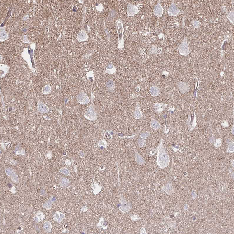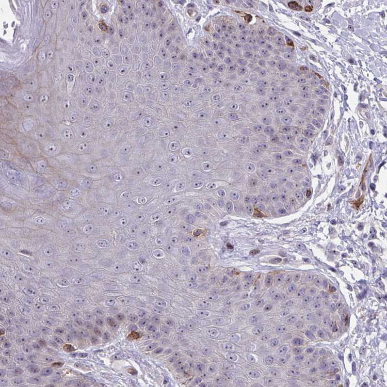 Immunohistochemical staining of human fallopian tube shows weak nucleolar positivity in glandular cells.