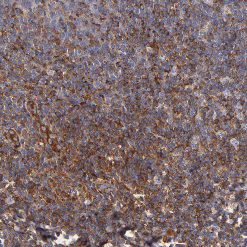 Immunohistochemical staining of human small intestine shows strong cytoplasmic positivity in glandular cells.