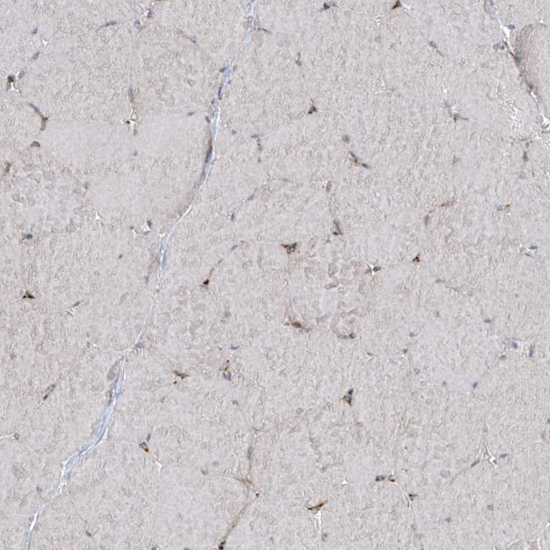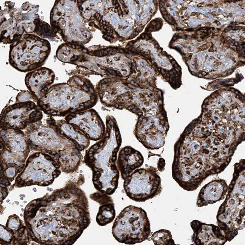 Immunohistochemical staining of human small intestine shows strong cytoplasmic positivity in glandular as well as lymphoid cells.