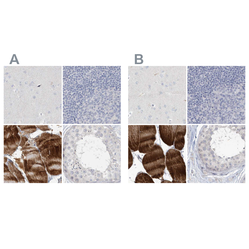 Immunohistochemistry analysis in human skeletal muscle and skin tissues using Anti-MYOT antibody. Corresponding MYOT RNA-seq data are presented for the same tissues.
