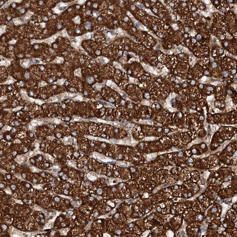 Immunohistochemical staining of human skeletal muscle shows moderate cytoplasmic positivity in myocytes.