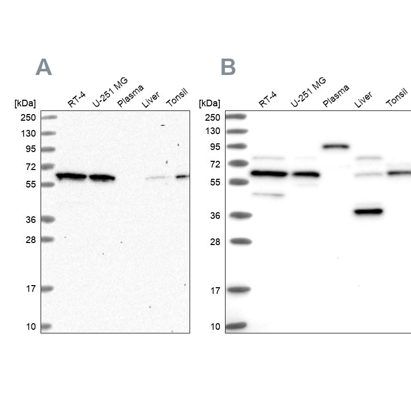 Immunohistochemical staining of human cerebral cortex, colon, prostate and testis using Anti-NAE1 antibody HPA041178 (A) shows similar protein distribution across tissues to independent antibody HPA042041 (B).