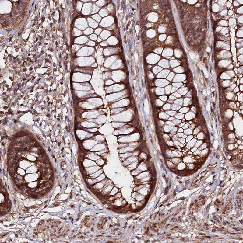 Immunohistochemical staining of human testis shows moderate cytoplasmic positivity in cells in seminiferous ducts.
