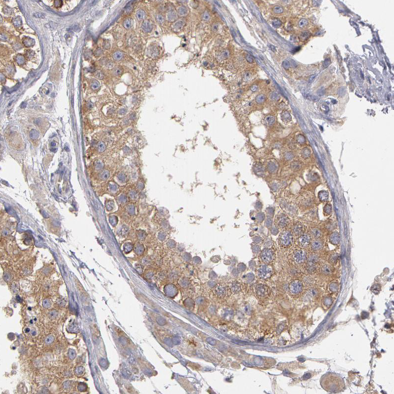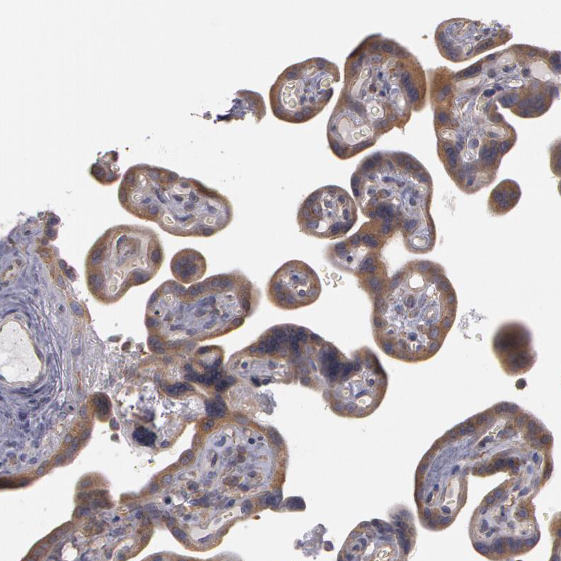 Immunohistochemical staining of human fallopian tube shows weak to moderate cytoplasmic positivity in glandular cells.