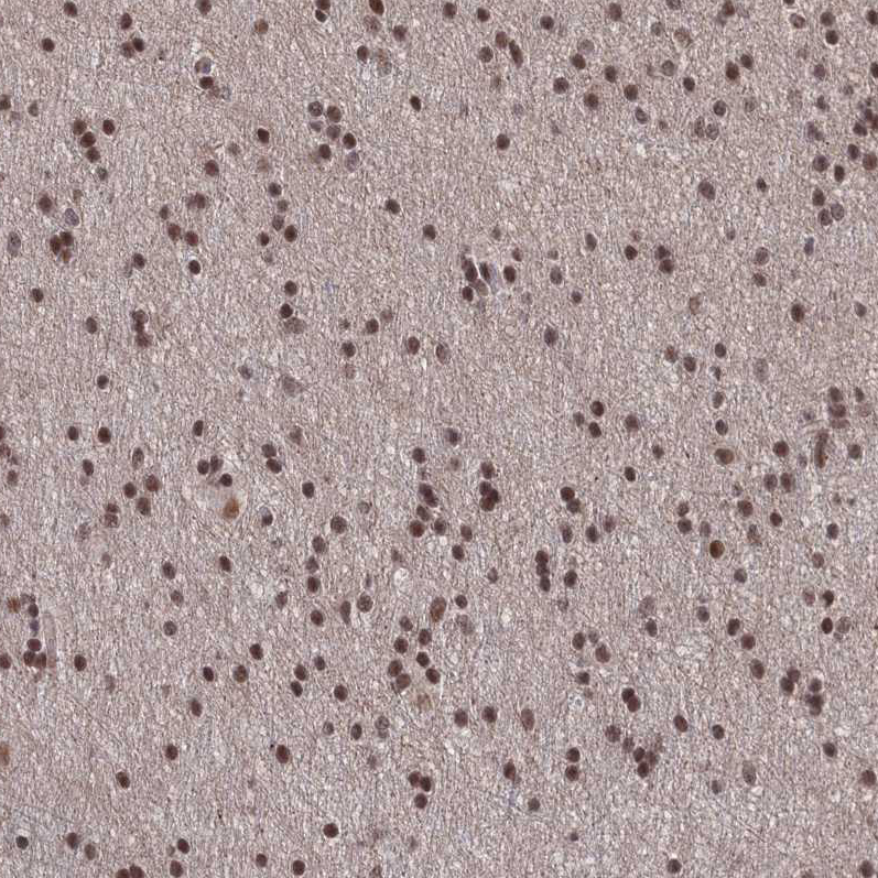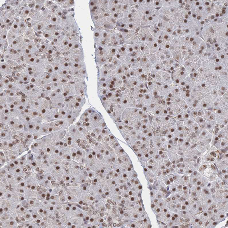 Immunohistochemical staining of human testis shows strong nuclear positivity in cells in seminiferous ducts and leydig cells.