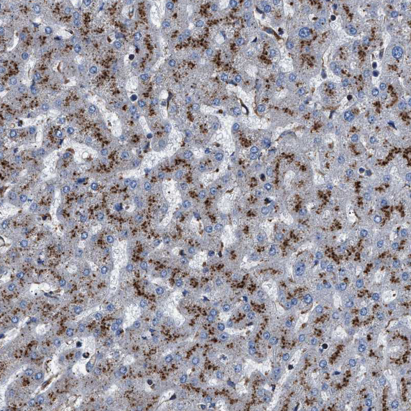Immunohistochemical staining of human kidney shows strong granular cytoplasmic positivity in cells in tubules, while glomeruli are negative.