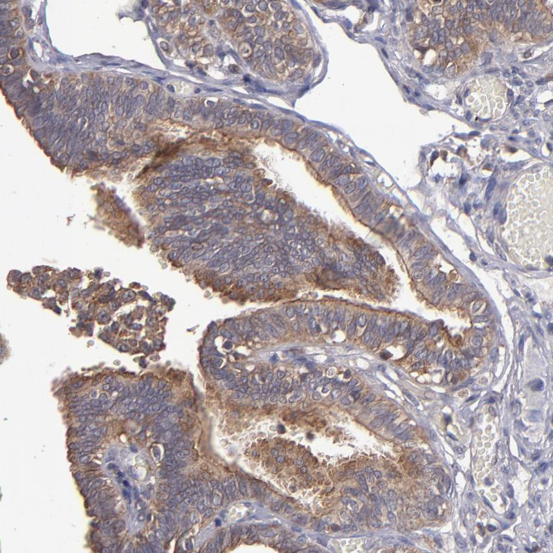 Immunohistochemical staining of human cerebellum shows moderate cytoplasmic positivity in Purkinje cells.