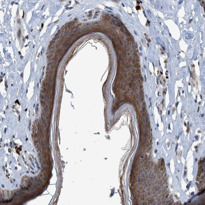 Immunohistochemical staining of human cerebellum shows strong cytoplasmic and membranous positivity in Purkinje cells.