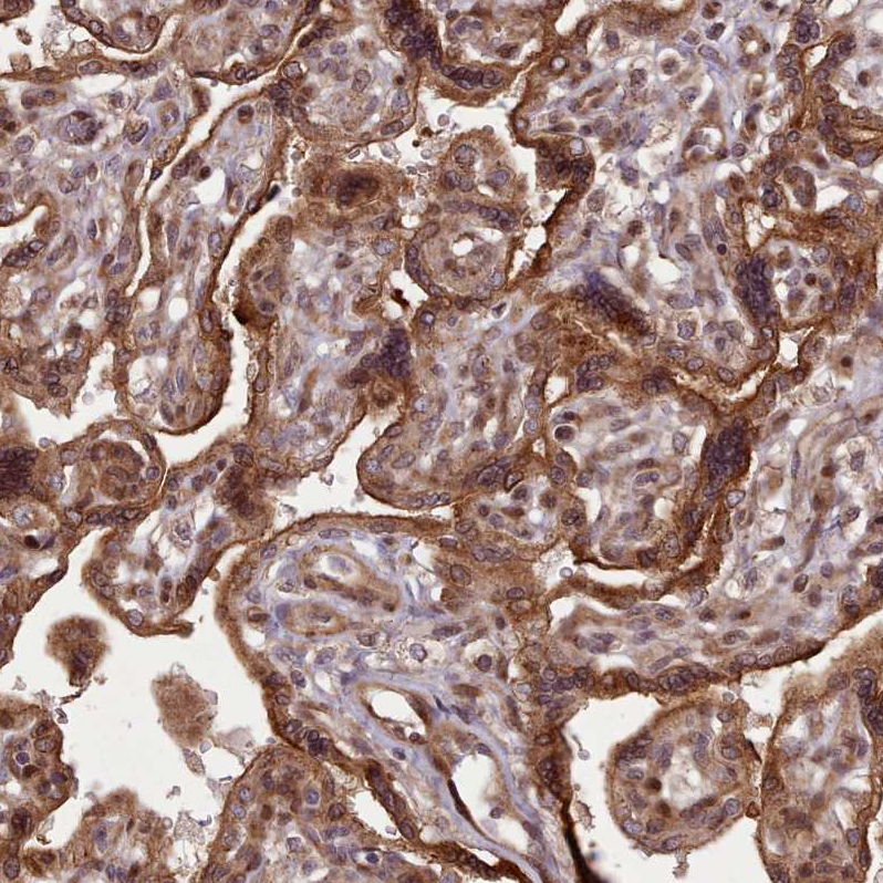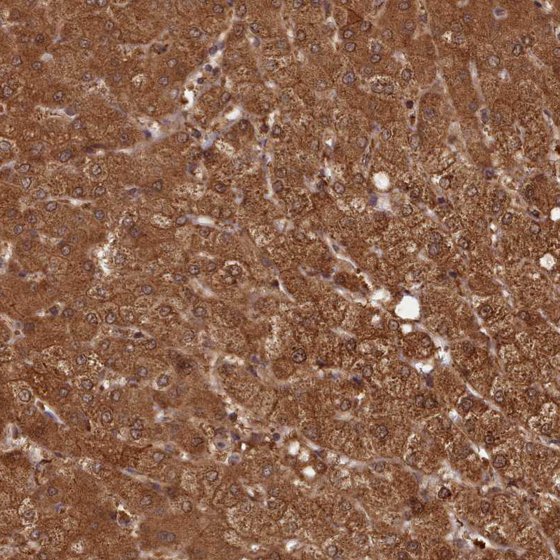 Immunohistochemical staining of human kidney shows strong cytoplasmic positivity in cells in tubules.