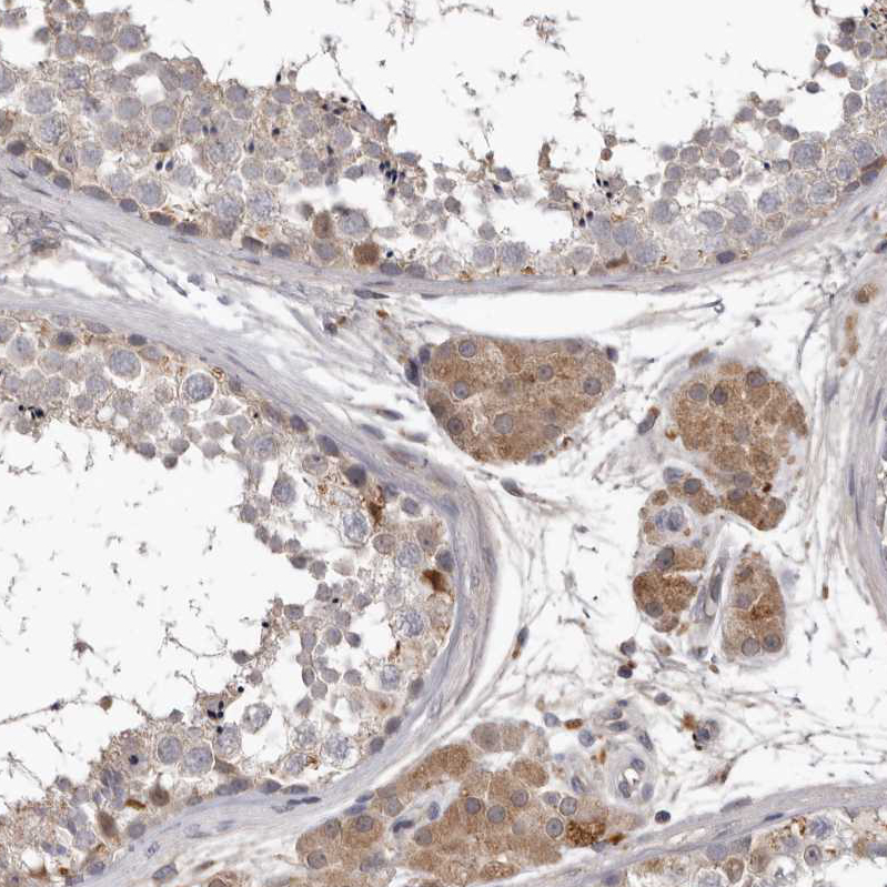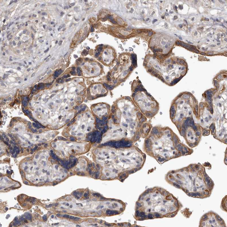Immunohistochemical staining of human upper gastrointestinal shows weak to moderate membranous and cytoplasmic positivity in glandular cells.