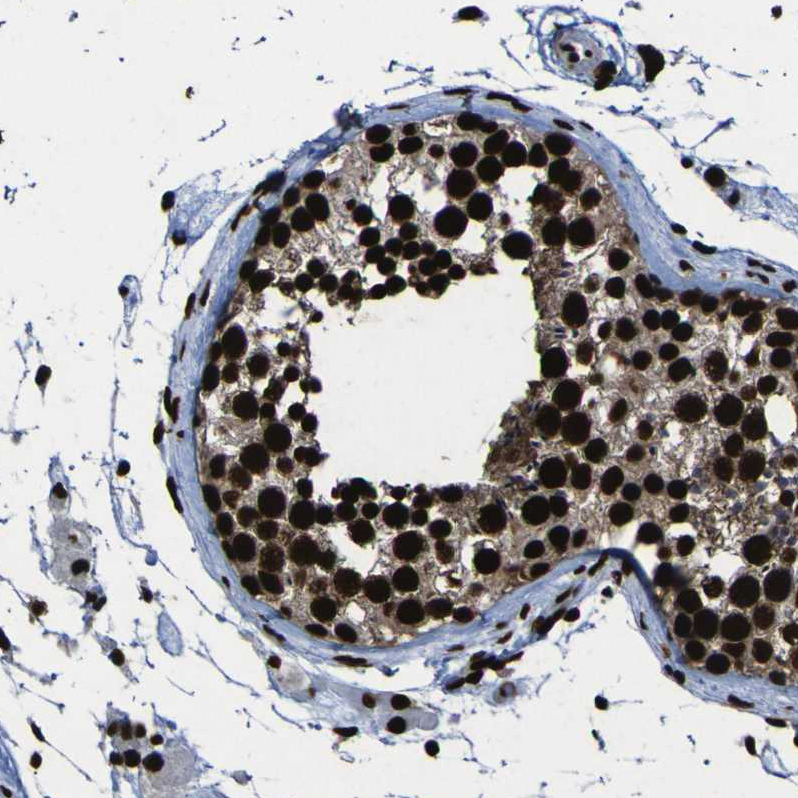 Immunohistochemical staining of human endometrium shows moderate to strong nuclear positivity in glandular cells.