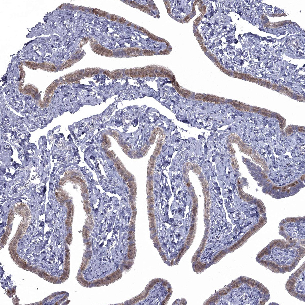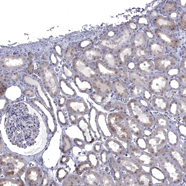Immunohistochemical staining of human Duodenum shows moderate cytoplasmic positivity in glandular cells.