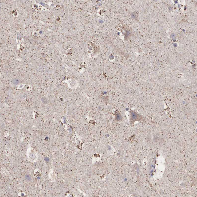 Immunohistochemical staining of human cerebellum shows strong cytoplasmic positivity in dendrites.