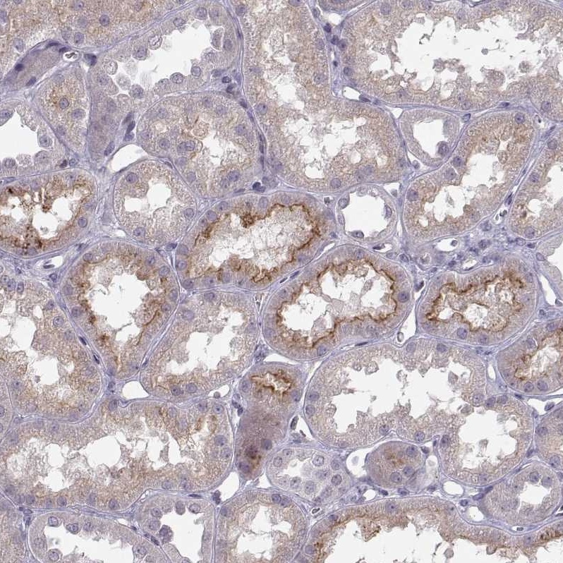 Immunohistochemical staining of human cerebral cortex shows moderate membranous positivity in glial cells.