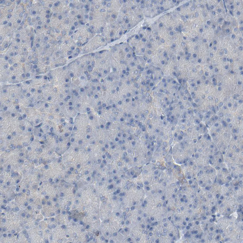 Immunohistochemical staining of human cerebral cortex shows moderate cytoplasmic positivity in neuronal cells.