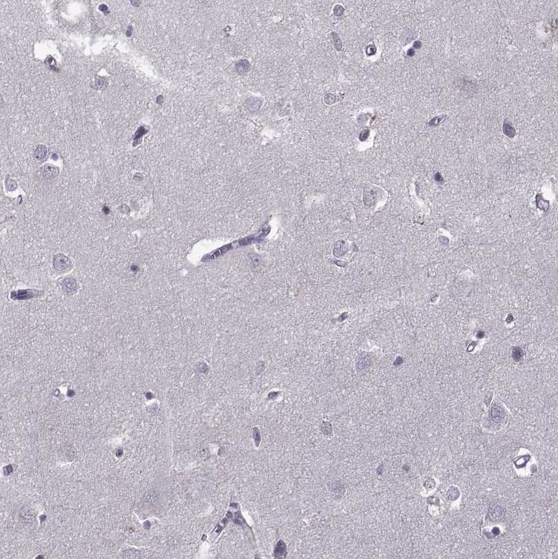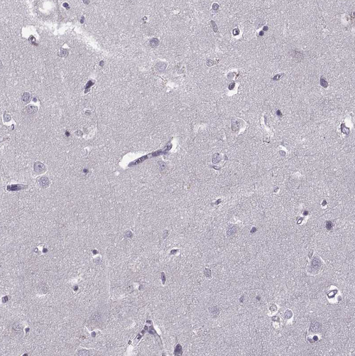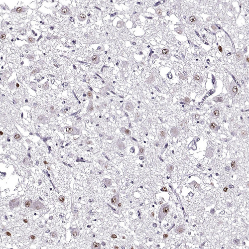 Immunohistochemical staining of human hypothalamus shows nuclear positivity in neurons.