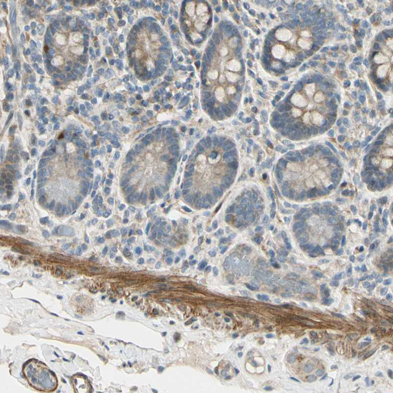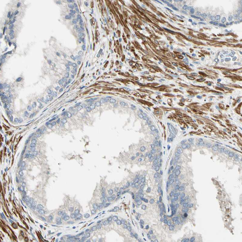 Immunohistochemical staining of human smooth muscle shows strong cytoplasmic positivity in myocytes.