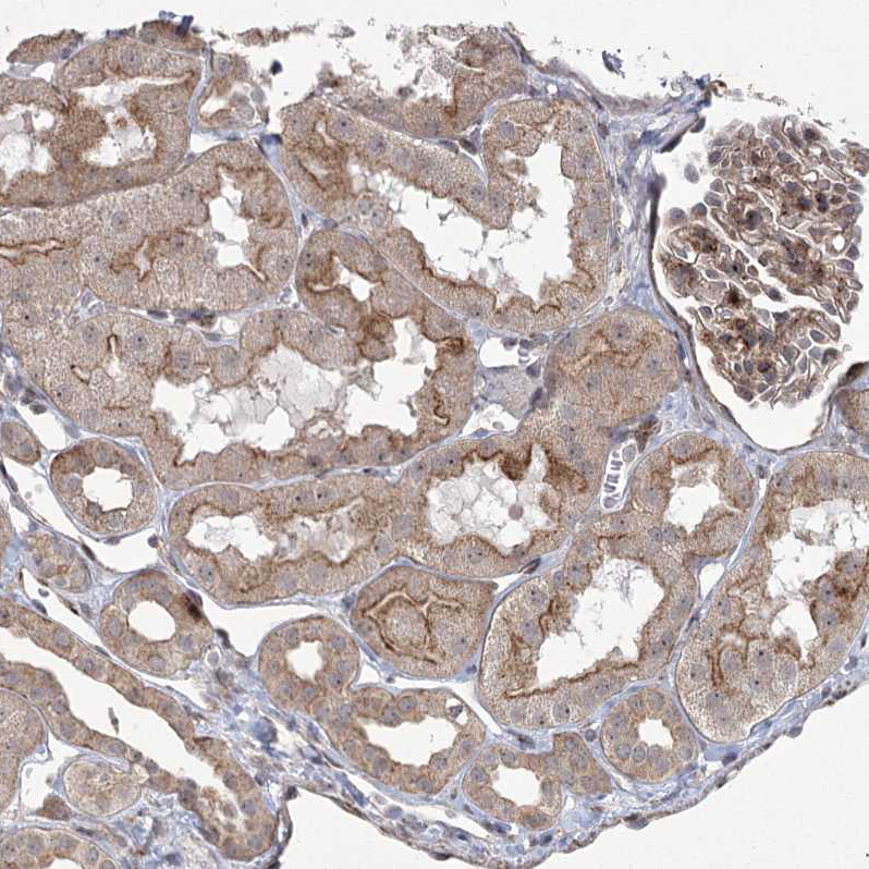 Immunohistochemical staining of human colon shows moderate to strong cytoplasmic positivity in glandular cells.