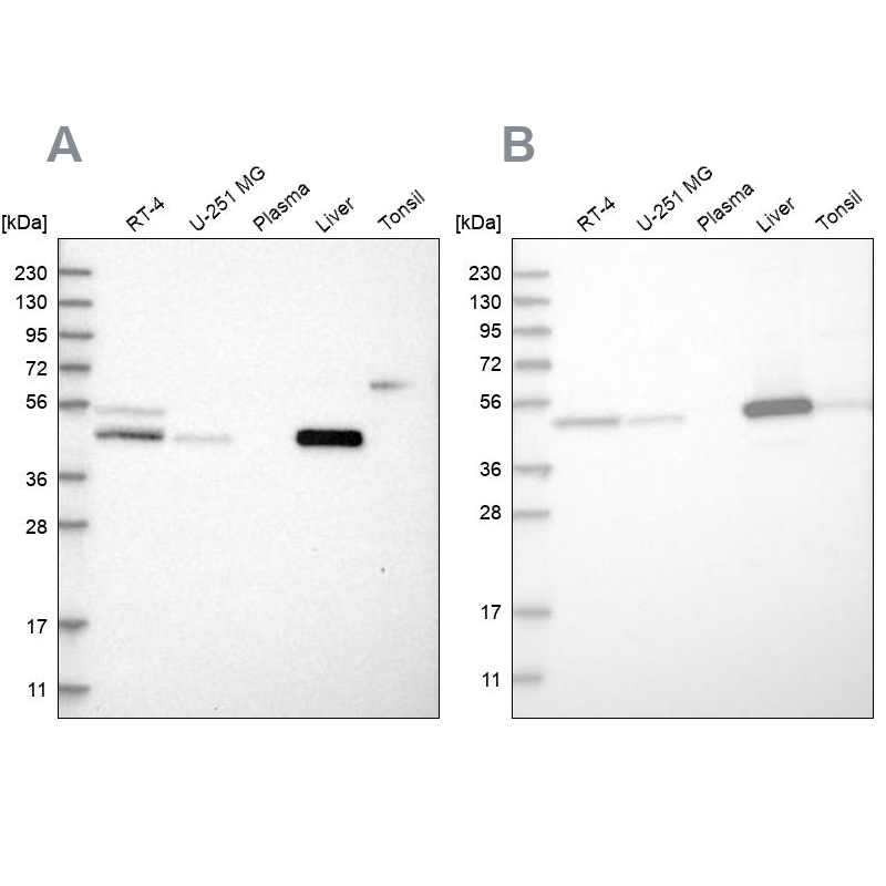 Immunohistochemical staining of human gastrointestinal, kidney, liver and testis using Anti-PCYT2 antibody HPA023033 (A) shows similar protein distribution across tissues to independent antibody HPA023034 (B).