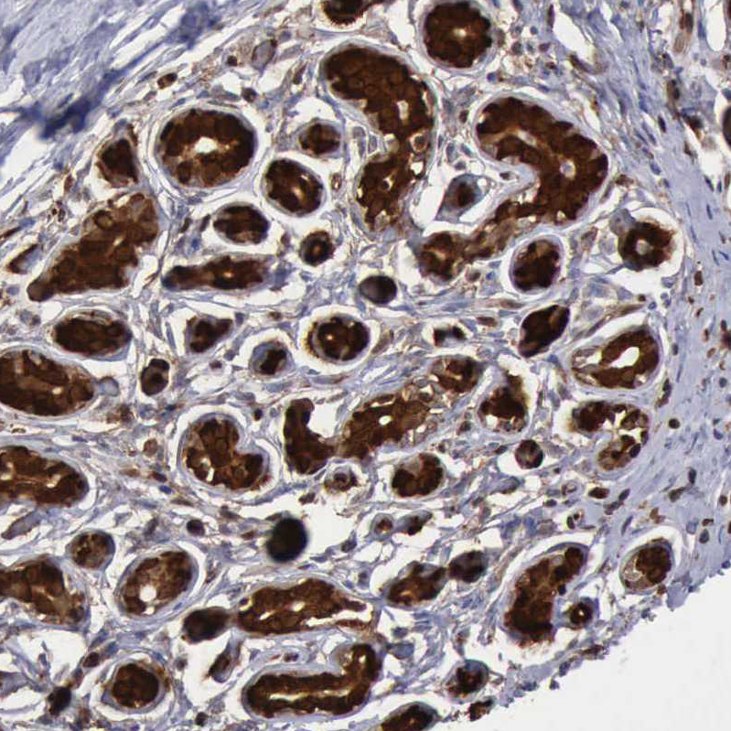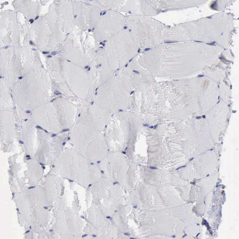 Immunohistochemistry analysis in human breast and skeletal muscle tissues using HPA001032 antibody. Corresponding PDCD4 RNA-seq data are presented for the same tissues.