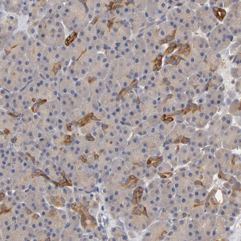 Immunohistochemical staining of human prostate shows weak to moderate cytoplasmic positivity in smooth muscle cells.