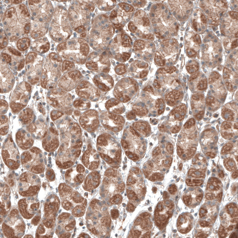 Immunohistochemical staining of human endometrium shows moderate to strong cytoplasmic positivity in glandular cells.