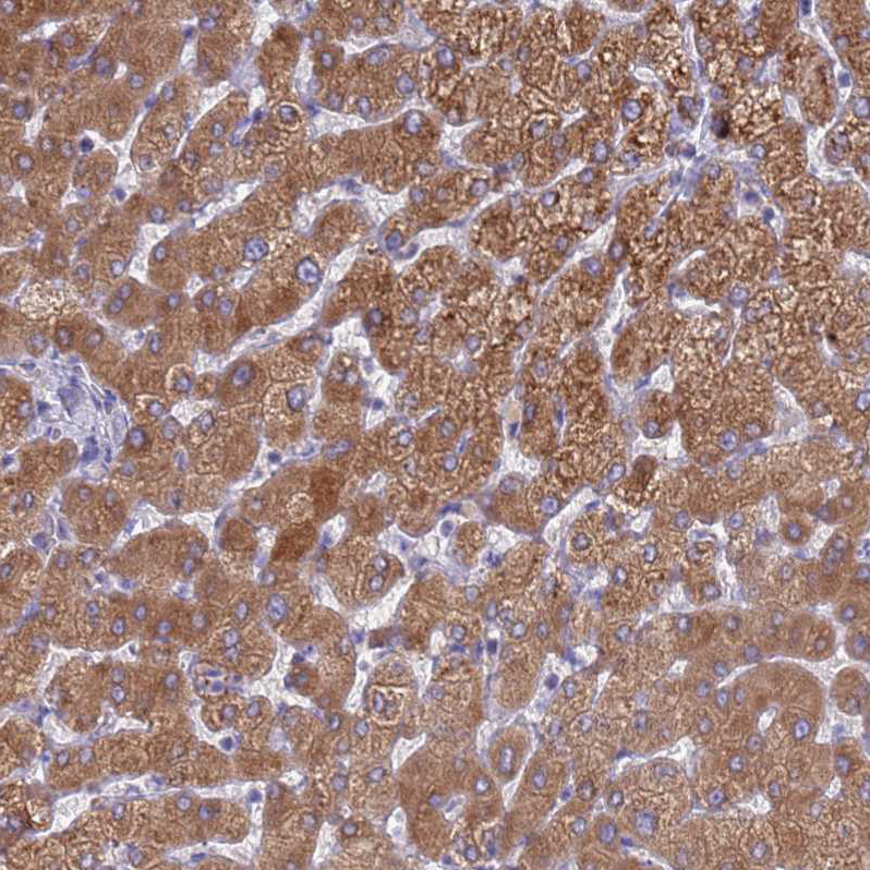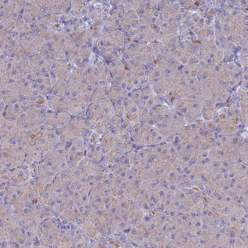Immunohistochemical staining of human cerebral cortex shows weak granular cytoplasmic positivity in neurons.