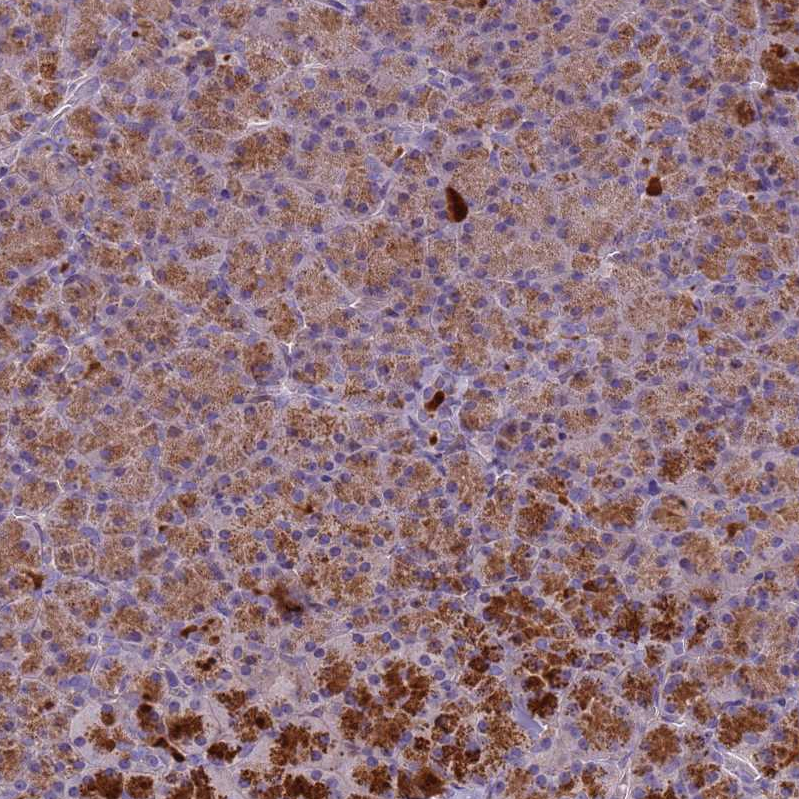Immunohistochemical staining of human heart muscle shows moderate cytoplasmic positivity in cardiomyocytes.