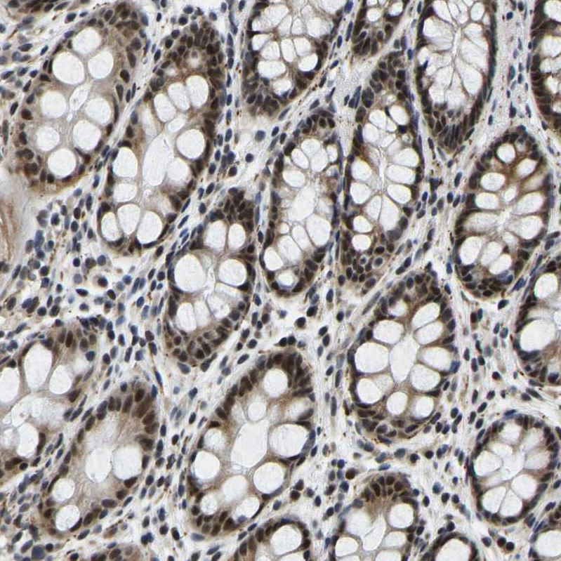 Immunohistochemical staining of human testis shows strong nuclear positivity in cells in seminiferous ducts.