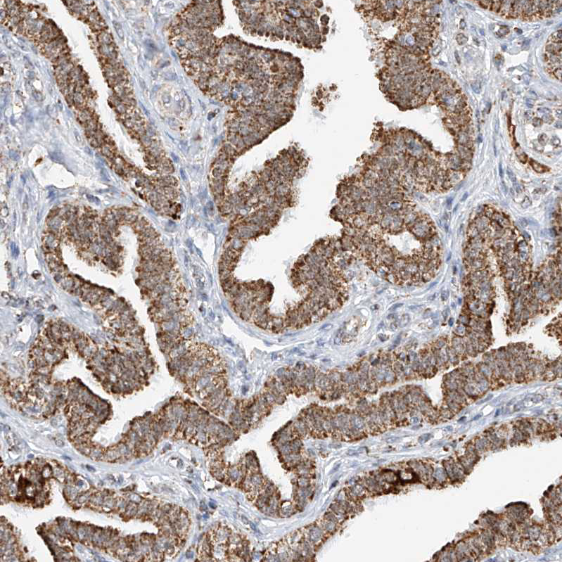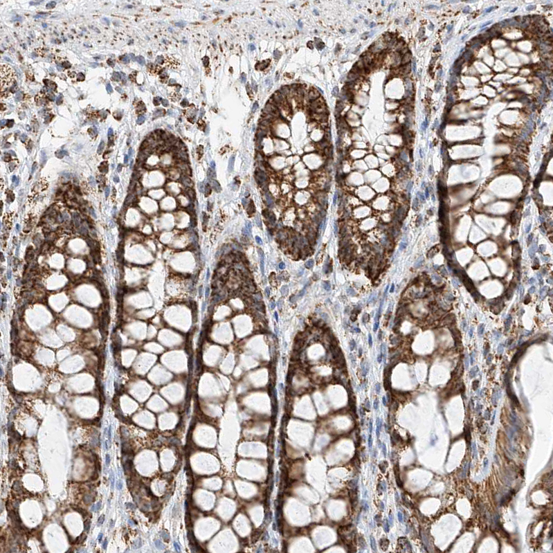 Immunohistochemical staining of human kidney shows strong granular cytoplasmic positivity in cells in tubules.