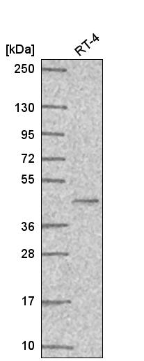 Western blot analysis in human cell lines RT-4 and U-251MG using Anti-PPARG antibody. Corresponding PPARG RNA-seq data are presented for the same cell lines. Loading control: Anti-GAPDH.