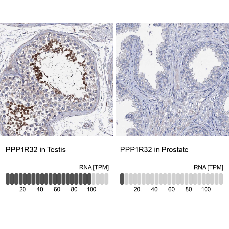 Immunohistochemistry analysis in human testis and prostate tissues using Anti-PPP1R32 antibody. Corresponding PPP1R32 RNA-seq data are presented for the same tissues.