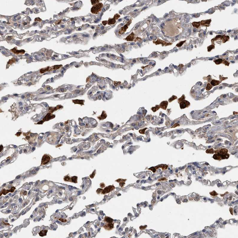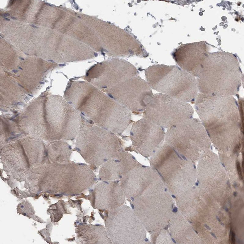 Immunohistochemical staining of human skeletal muscle shows moderate cytoplasmic positivity in myocytes.