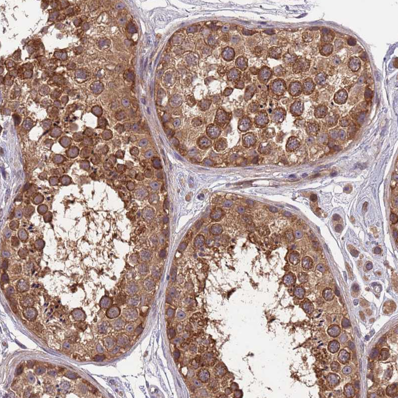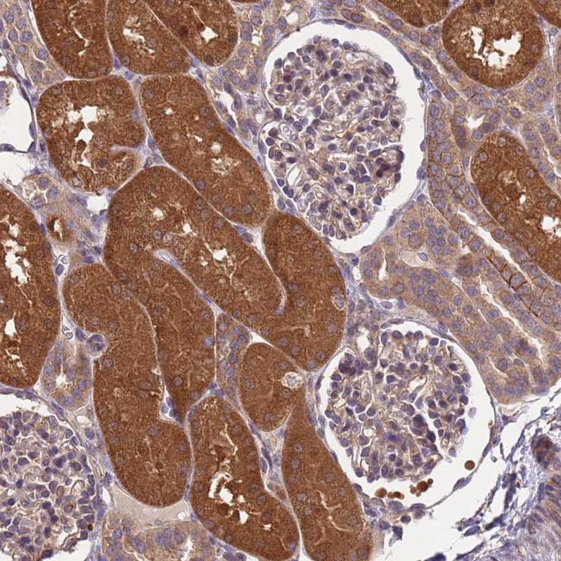Immunohistochemical staining of human cerebral cortex shows strong cytoplasmic positivity in neuronal cells and neuropil.