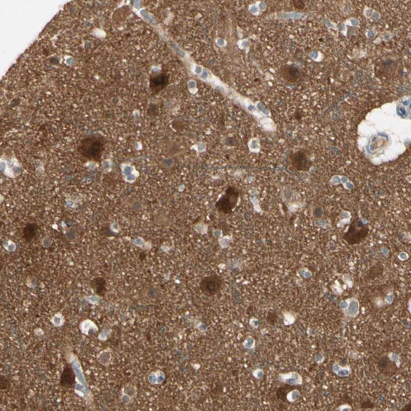 Immunohistochemical staining of human cerebral cortex shows strong cytoplasmic positivity in neuronal cells.