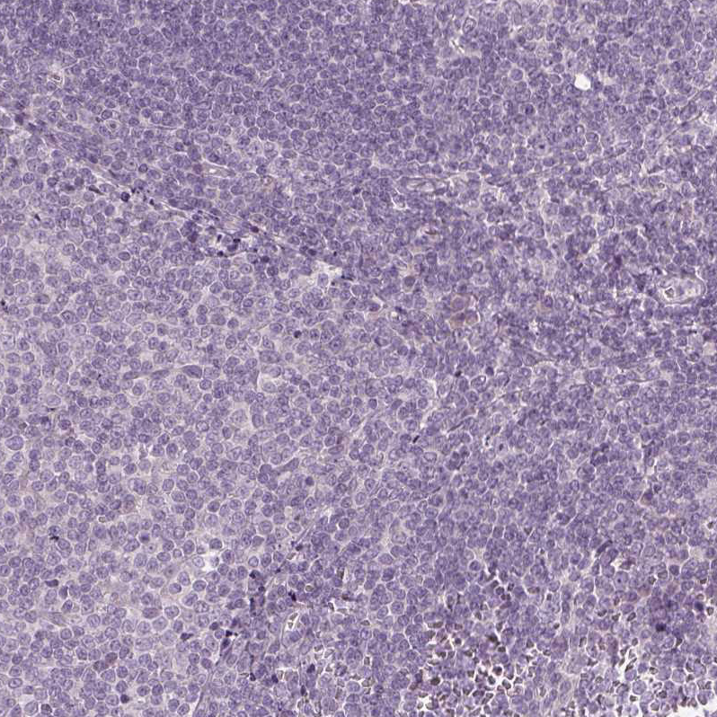 Immunohistochemical staining of human small intestine shows moderate granular cytoplasmic positivity in glandular cells.