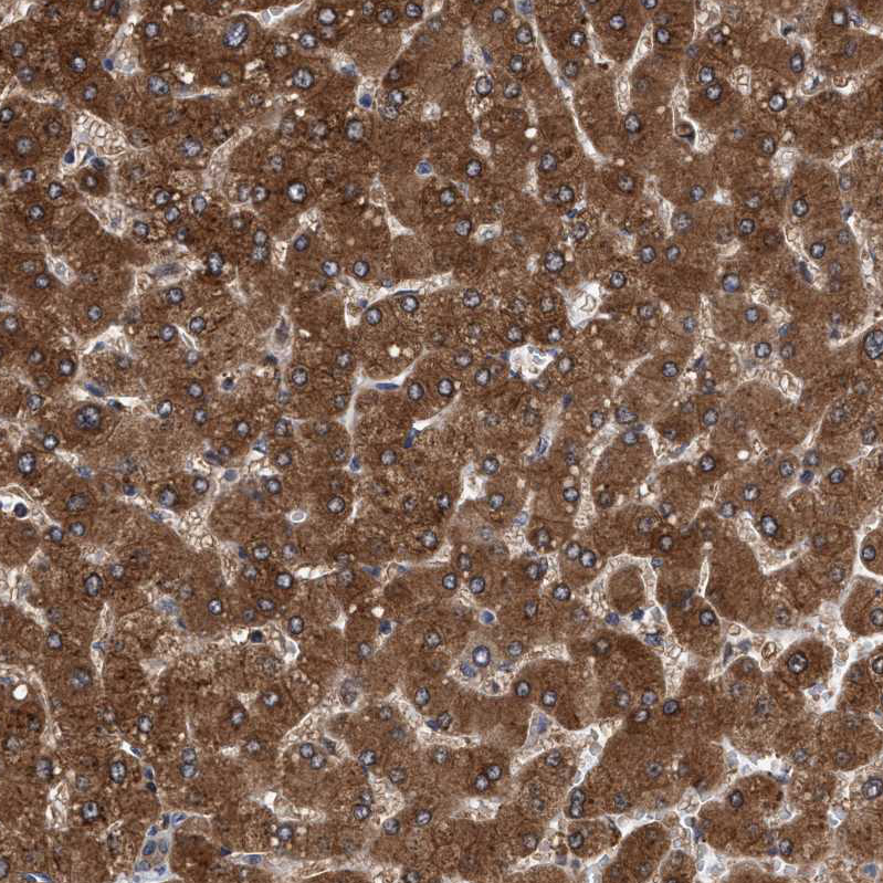 Immunohistochemical staining of human testis shows moderate cytoplasmic and nuclear positivity in cells in seminiferous ducts.