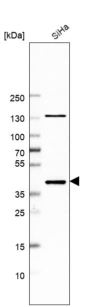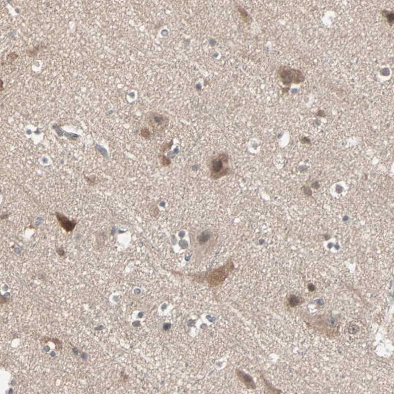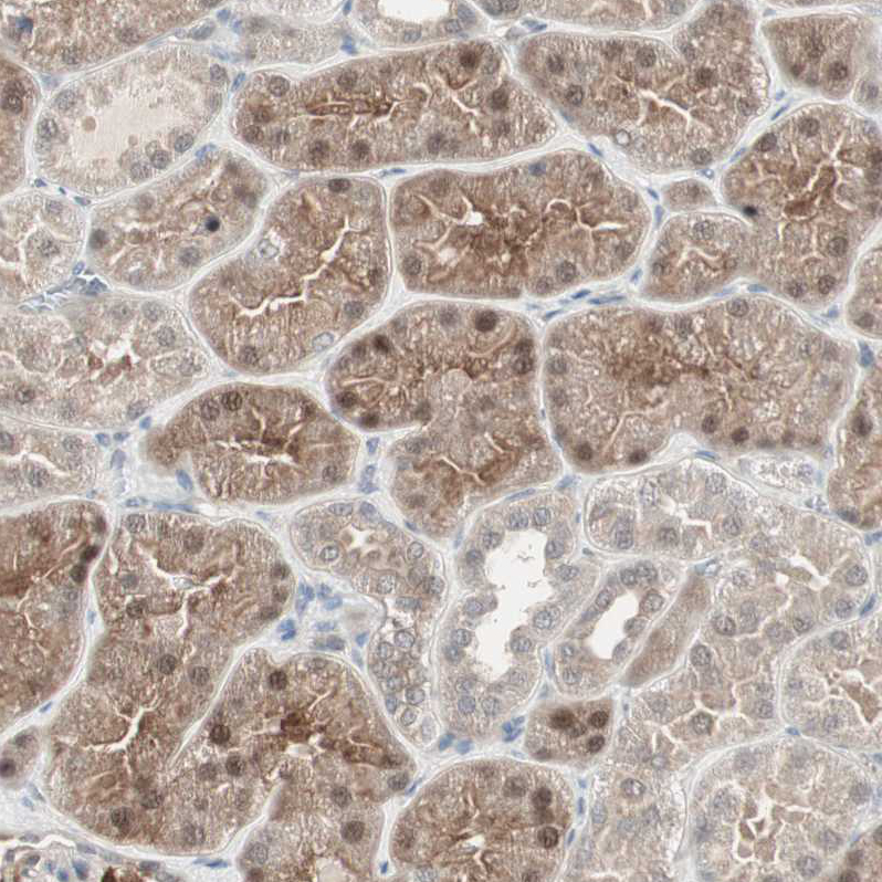 Immunohistochemical staining of human testis shows strong cytoplasmic and nuclear positivity in cells in seminiferous ducts and leydig cells.