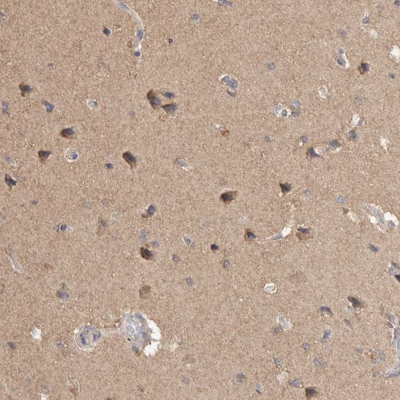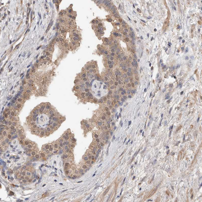 Immunohistochemical staining of human testis shows moderate cytoplasmic positivity in cells in seminiferous ducts.