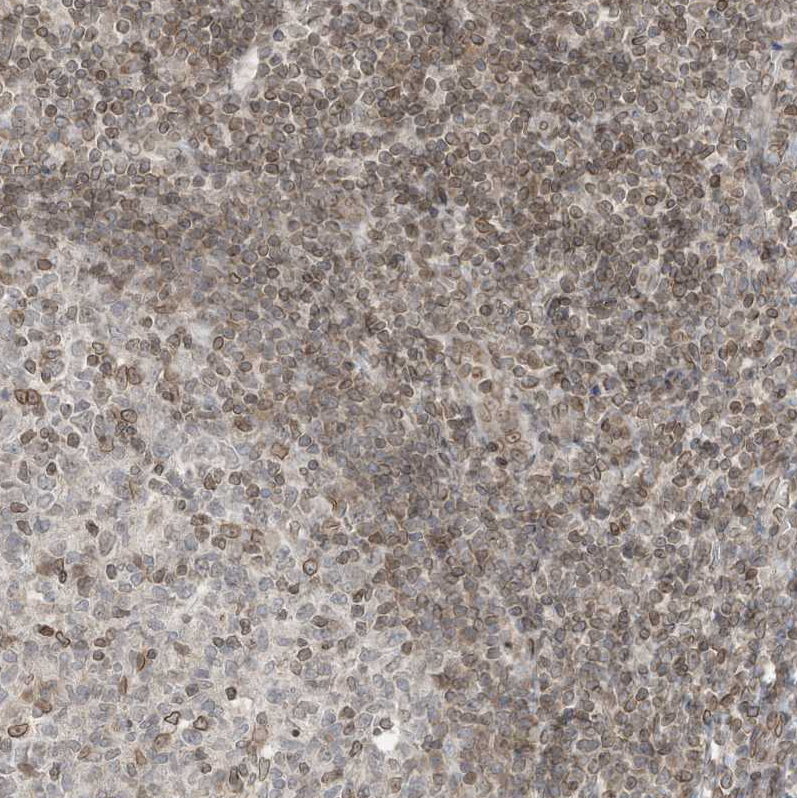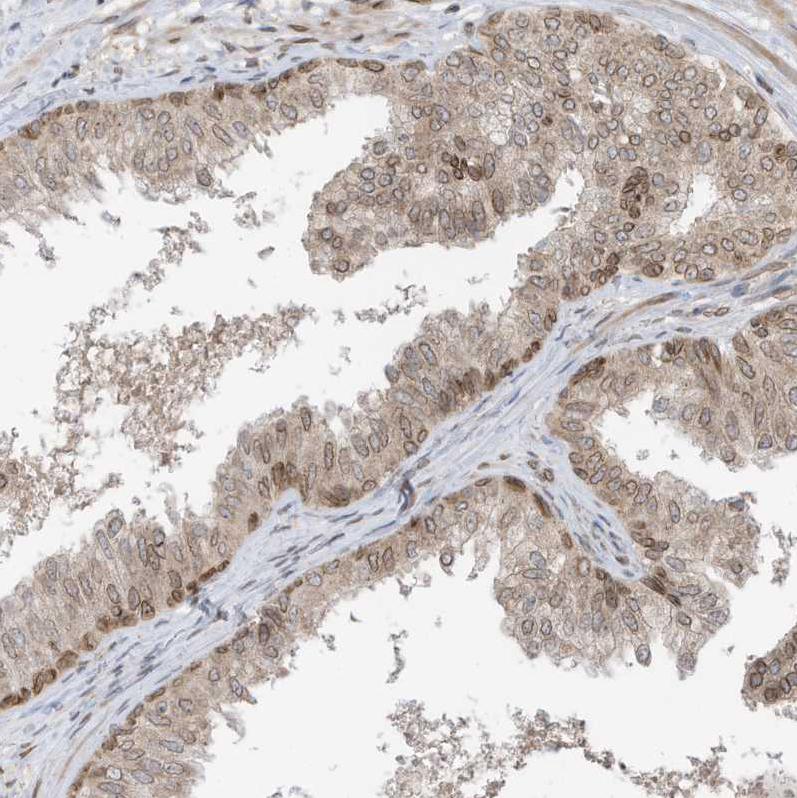 Immunohistochemical staining of human endometrium shows moderate positivity in nuclear membrane in glandular cells.