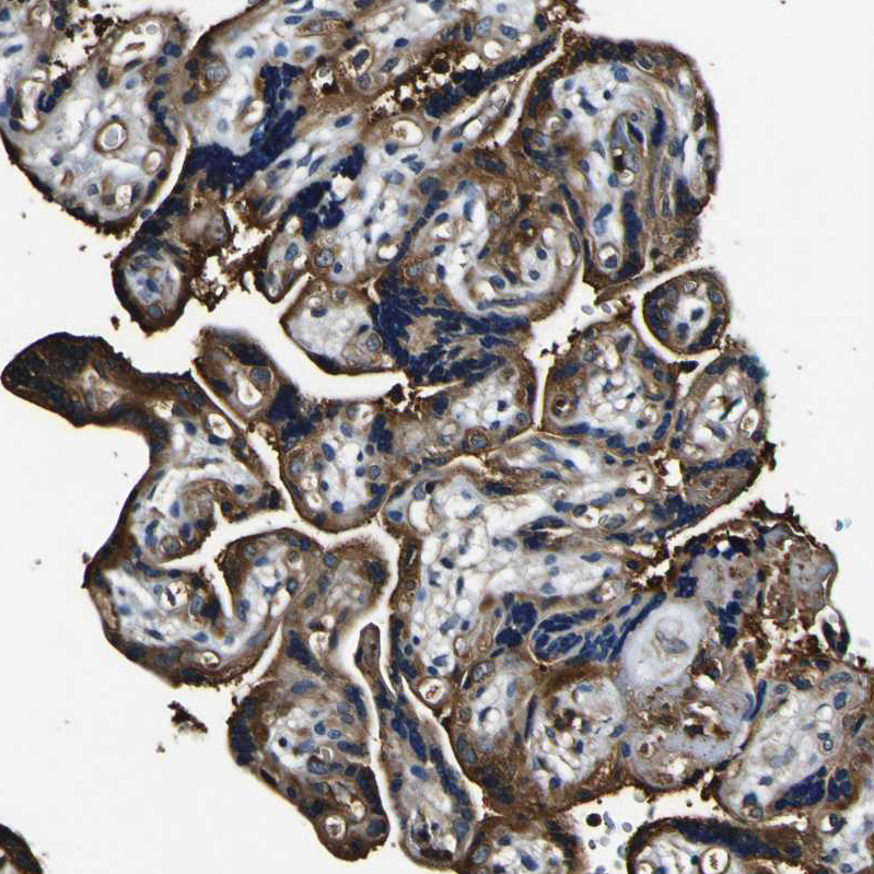 Immunohistochemical staining of human small intestine shows cytoplasmic positivity in glandular cells.