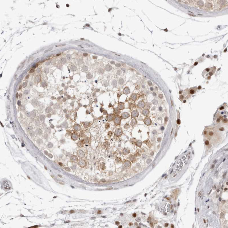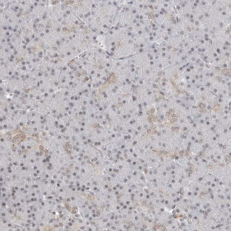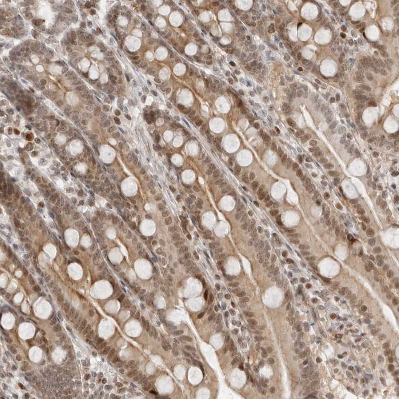 Immunohistochemical staining of human endometrium shows moderate cytoplasmic positivity in glandular cells.
