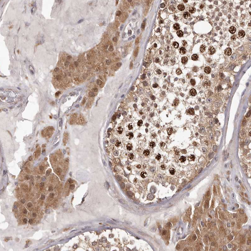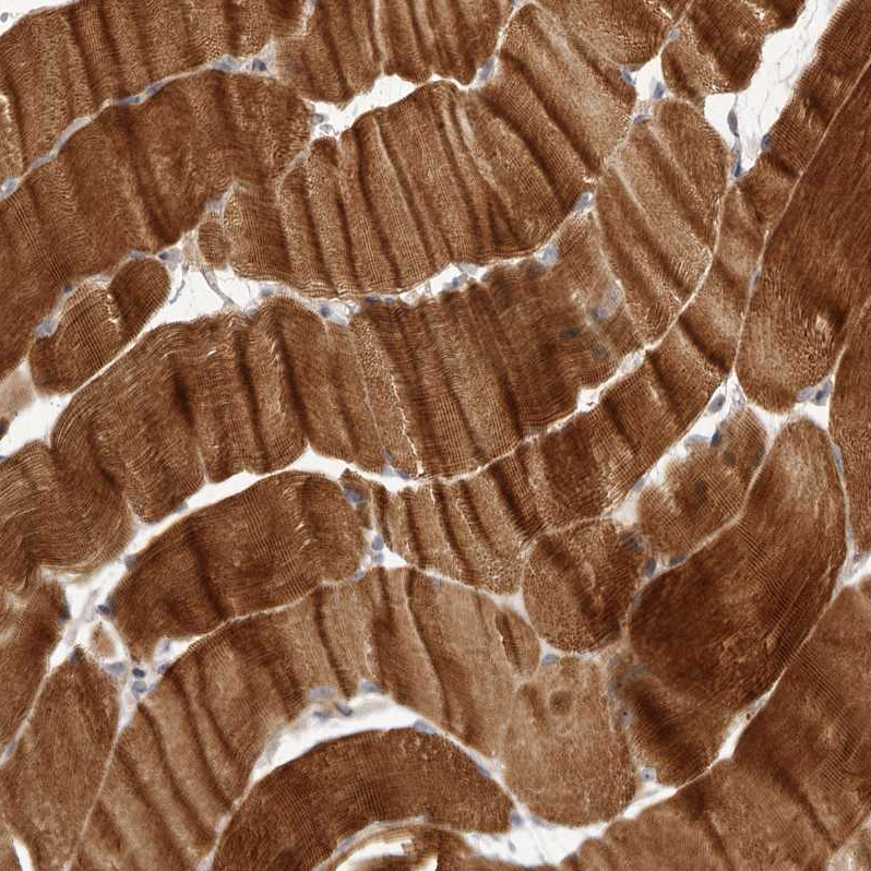 Immunohistochemical staining of human skeletal muscle shows strong cytoplasmic positivity in myocytes.