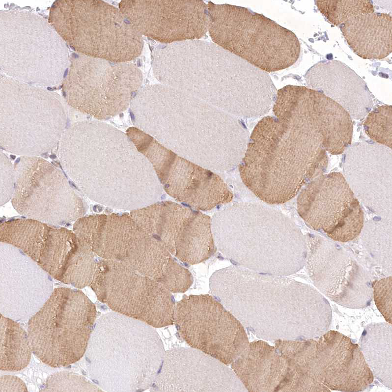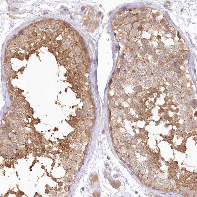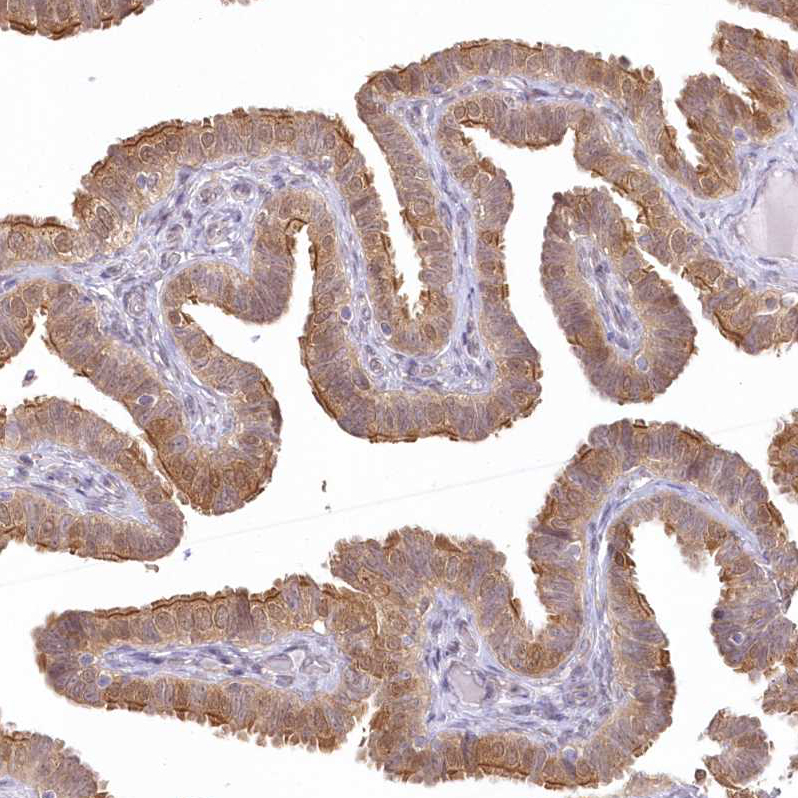 Immunohistochemical staining of human duodenum shows moderate cytoplasmic and membranous positivity in glandular cells.