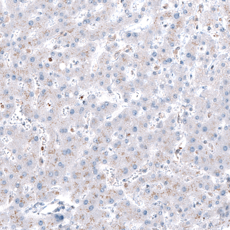 Immunohistochemical staining of human cerebral cortex shows moderate positivity in neuronal processes in neuropil.
