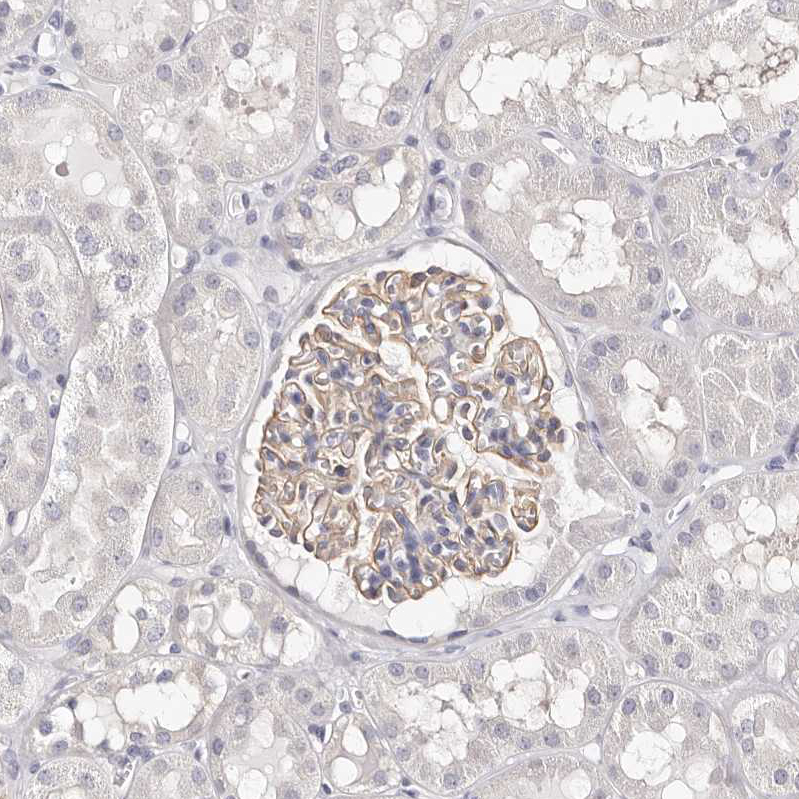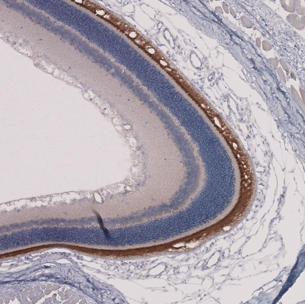 Immunohistochemical staining of human eye, retina shows strong cytoplasmic positivity in photoreceptor cells.