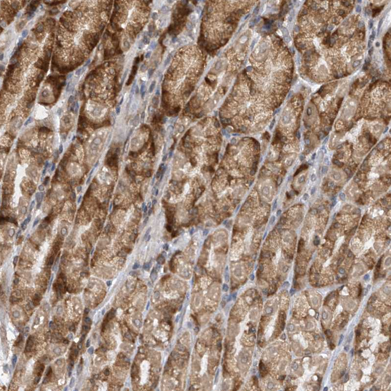 Immunohistochemical staining of human pancreas shows strong cytoplasmic-membranous positivity in exocrine glandular cells moderate cytoplasmic-membranous positivity in endocrine glandular cells.