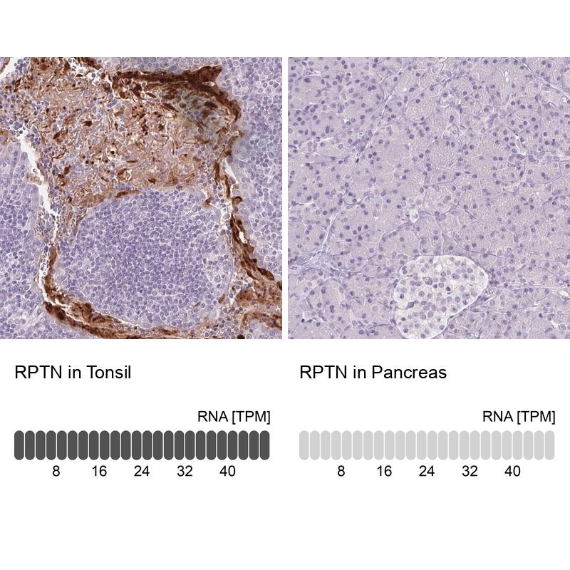 Immunohistochemistry analysis in human tonsil and cerebral cortex tissues using Anti-RPTN antibody. Corresponding RPTN RNA-seq data are presented for the same tissues.