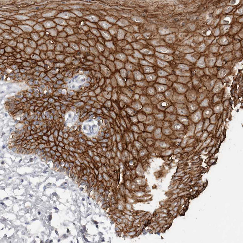 Immunohistochemistry analysis in human esophagus and liver tissues using HPA027613 antibody. Corresponding S100A14 RNA-seq data are presented for the same tissues.
